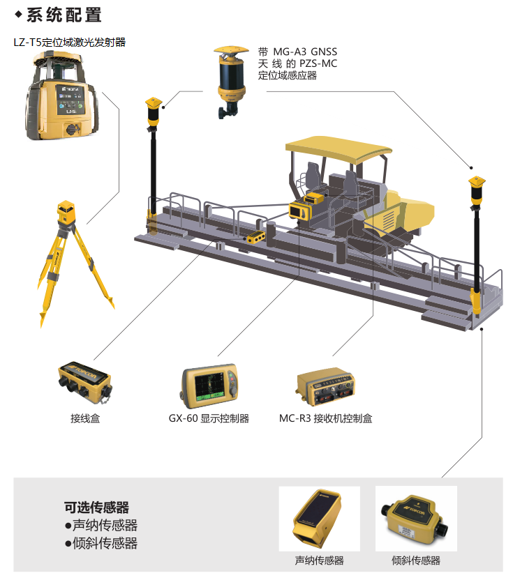 摊铺机控制系统支持多种配置组合,可根据实际工作选择不同传感器与配件。