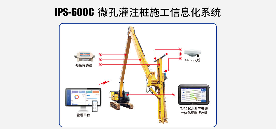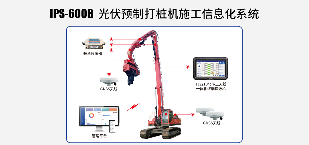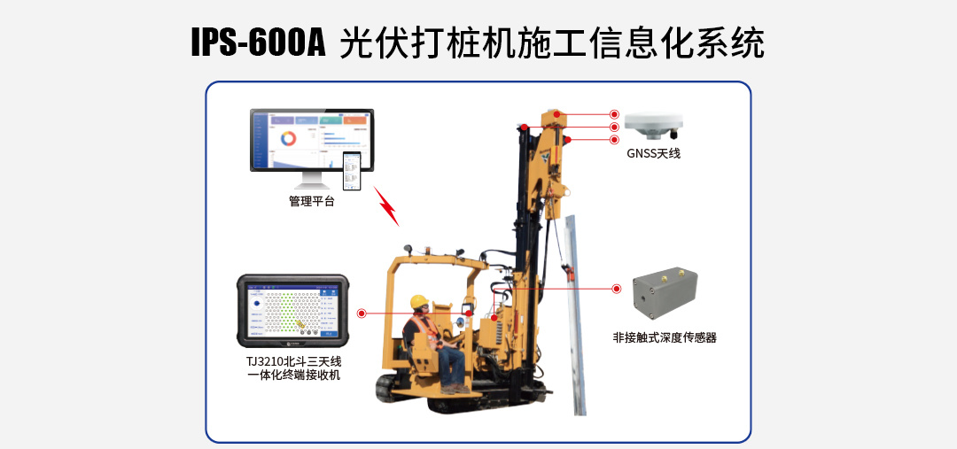 光伏桩施工条件比较恶劣,传统施工采用人工放样,桩顶高程的控制及桩位精度、垂直度等信息需后期人工测量,无施工过程数据记录,施工单位需要“三检人员到现场,无法真实掌握施工质量及进度。 IPS-600光伏打桩施工信息化系统,将施工过程数据进行实时测读采集,并同步数据上传到云端管理平台,进行计算、分析、比对、预警等,实时查看施工过程数据及成果。现场实时引导桩机施工作业,对桩顶标高和孔深进行实时控制并指导施工,平面精度士3cm,桩深精度士10cm。